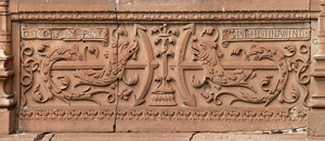 Es el emblema de Augusto: áncora y delfín es decir: Fermitatem cum agilitate conjunctam, y la divisa: Festina lente, repetida dos veces en latín y en griego como la decía Augusto. Emblema y divisa aparecen en sus monedas.